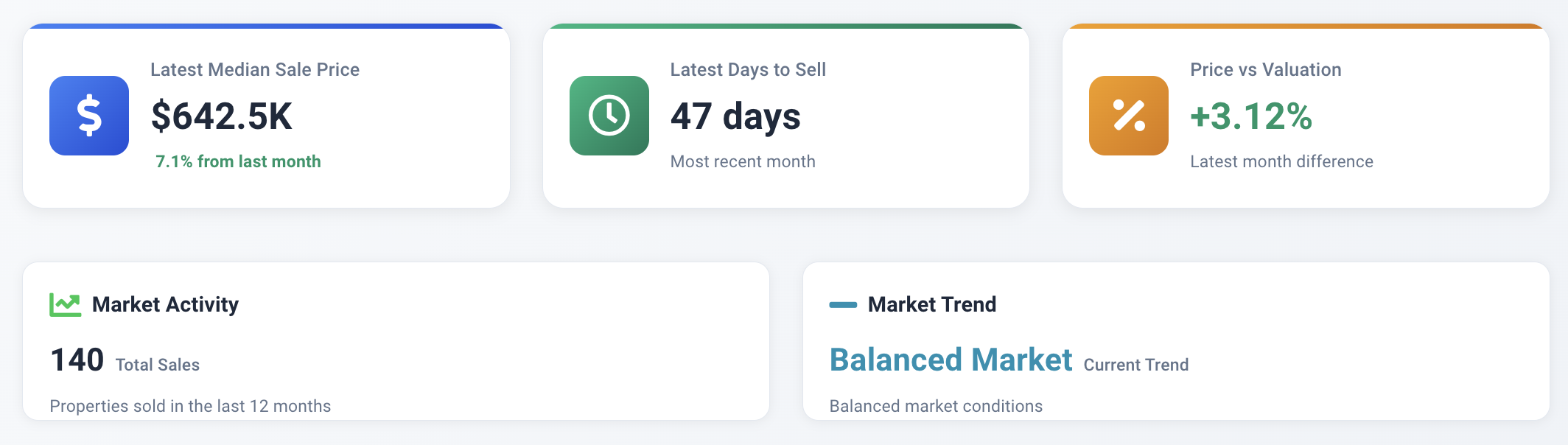 Get suburb market data including price trends, sales activity, market conditions, and selling methods - perfect for CMAs, listing strategies, and investment analysis