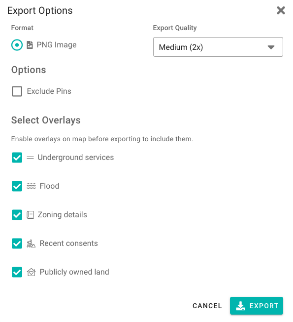 Save any map view as a PNG image with your chosen overlays - perfect for reports, presentations, and client communications.
